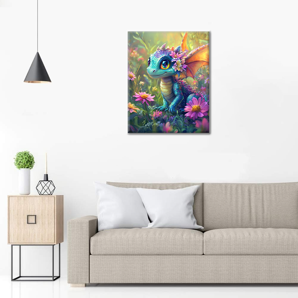 花に囲まれたカラフルなドラゴン - 数字で塗り絵