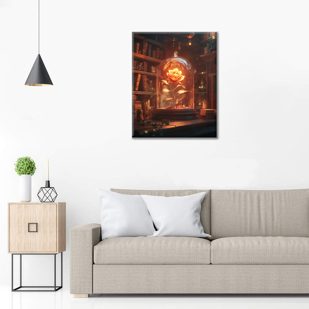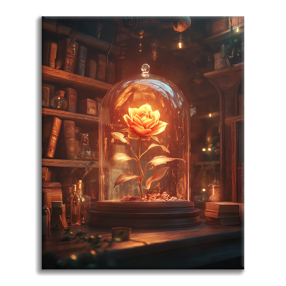 ガラスのドームの中に咲くバラの花が本当に美しく、まるで魔法のような雰囲気です。温かい光が花を照らしていて、見るたびに癒されます。